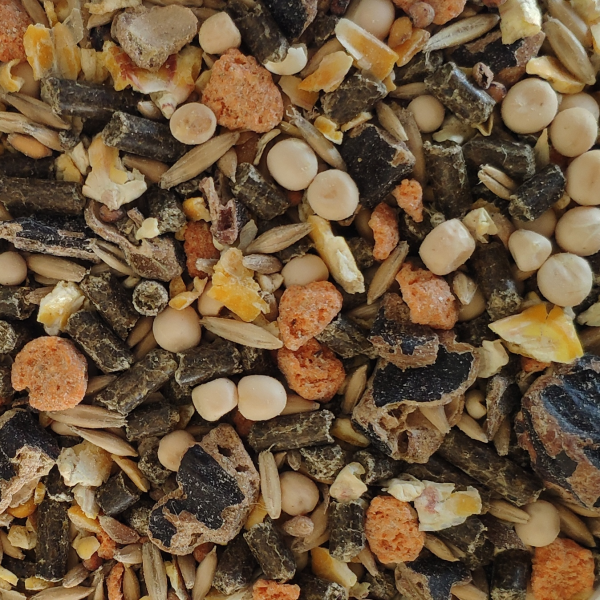 Composição: luzerna, sêmea granulada, flocos de milho geneticamente modificado, aveia, alfarroba, ervilha, extrusado cenoura, óleo de soja geneticamente modificada